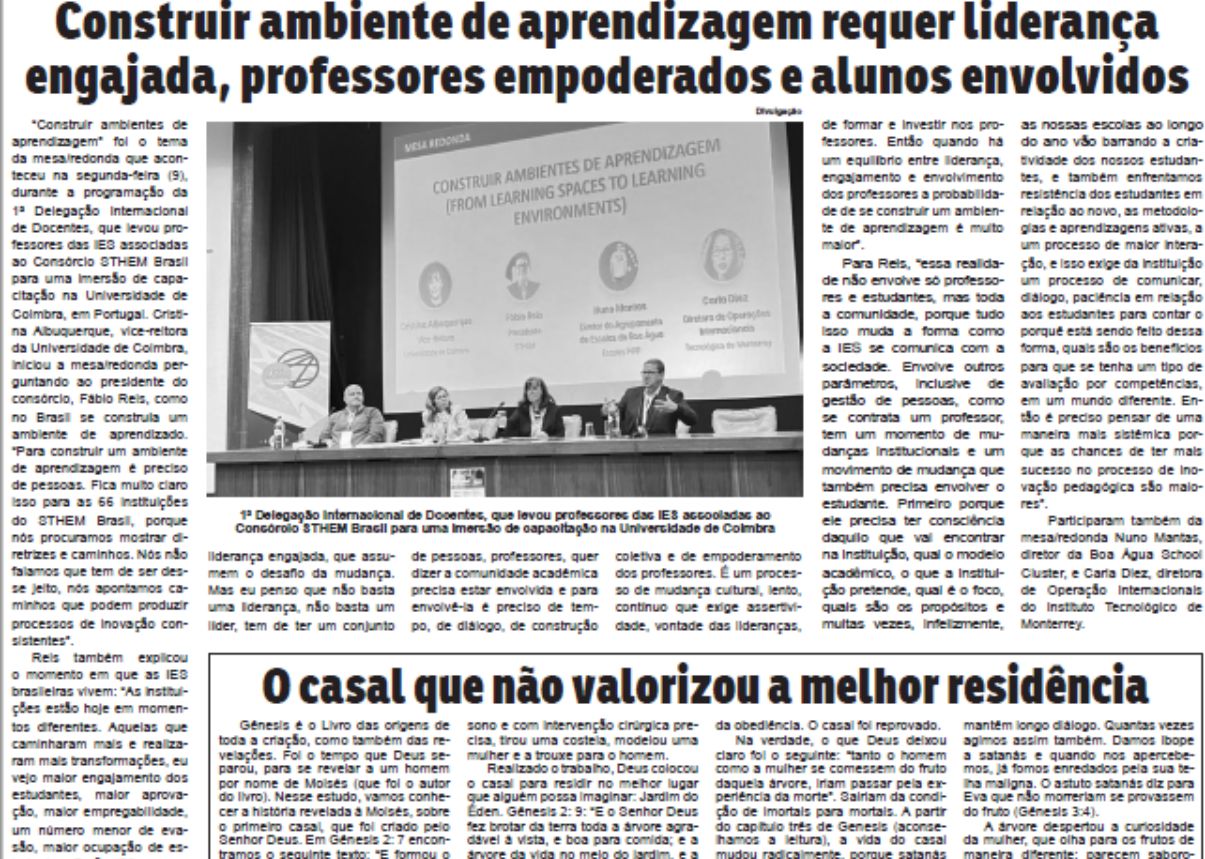 Diário de Coimbra, Diário As Beiras, Jornal UC (Universidade de Coimbra), o trio de veículos de Portugal, além do jornal Mídia Digital, os Blogs de José Armando Torres e de Ocimar Freitas, o portal Mais Superior e o Jornais Cidades de Marília e Jornal da Manhã divulgaram a visita da 1ª Delegação Internacional de Docentes brasileiros do Consórcio STHEM Brasil, para imersão de capacitação em Portugal, e também a assinatura do Protocolo de Colaboração da Iniciativa Estratégica para a Inovação Pedagógica. O evento ocorreu de 6 a 13 de janeiro e os docentes visitaram instituições de ensino superior em Lisboa, Coimbra e regiões do Porto.