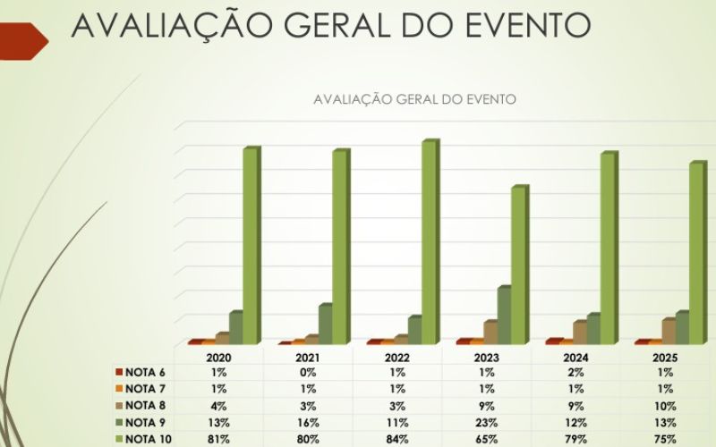 A avaliação dos participantes é excelente desde a primeira edição do evento, atribuindo notas 9 ou 10 para a satisfação, sendo este resultado informado por 90% dos participantes.