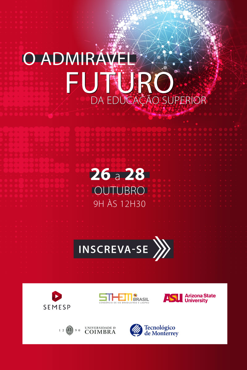 De 26 a 28 de outubro, o Consórcio STHEM Brasil, o Semesp, a Universidade de Coimbra, o Instituto Tecnológico de Monterrey e a Universidade do Estado do Arizona (ASU), com o patrocínio da Fundacred, realização o encontro que discutirá as boas práticas educacionais “O Admirável Mundo da Educação Superior”, totalmente gratuito, on-line e no horário das 9h ao meio-dia.